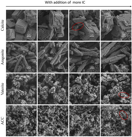 Figure 1 shows SEM images of the four forms of calcium carbonate and their respective lakes, with the four kinds of calcium carbonate in the first column. Calcite displays typical rhombohedral structures with cracked surfaces, resembling stacked shales, consistent with findings reported by Rodriguez-Blanco et al. [18]. Aragonite is rod-shaped with varying lengths, and its surface resembles dry and cracked hair. Vaterite particles resemble grape beads, forming clusters with appearance of large cavities, as also reported by Nebel et al. [14]. Compared to other forms, ACC exhibits much smaller spherical particles, aggregating to form a relatively compact structure consistent with the literature reports [19,20]. The addition of IC to the forming solution of each calcium carbonate did not noticeably change their micro-morphology, except for the introduction of bar structures (in red circle) into calcite, vaterite, and ACC. As confirmed by Figure S1a, the bar structure is a typical feature of IC particle, indicating that a few IC particles could form when high concentration of IC is used to fabricate the lakes.