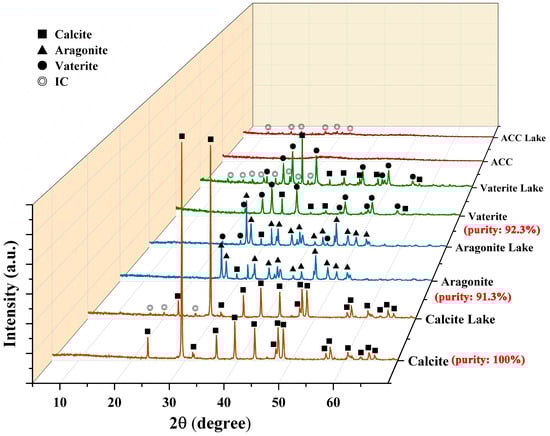 - Aragonite: 150 mL of 0.2 mol/L CaCl2 and 150 mL of 0.2 mol/L Na2CO3 were preheated to 80 °C in a water bath, respectively. After rapid mixing, the solution was centrifuged (5000 r/min for 5 min) to obtain sediment. The sediment was dried in an oven at 45 °C for 12 h and ground to obtain IC—aragonite lake.