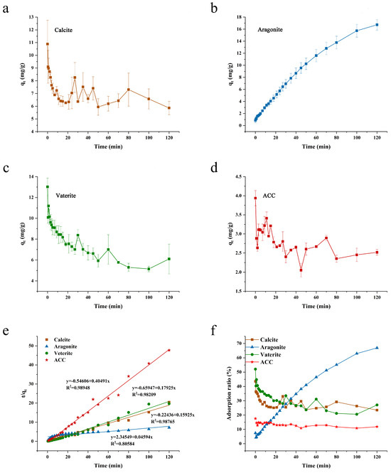 Kinetic curves for adsorption of IC by the four calcium carbonates using co-precipitation method ((a): Calcite; (b): Aragonite; (c): Vaterite; (d): ACC), fitting of the adsorption data into pseudo -second order model (e) and curves of adsorption ratio change with time (f).