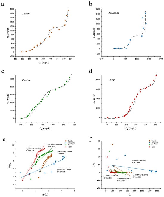 Isothermal adsorption curves ((a): Calcite; (b): Aragonite; (c): Vaterite; (d): ACC), fitting of isothermal data into Freundlich equation (e) and fitting of isothermal data into the Langmuir equation (f) (The hatched lines are visual fit only).