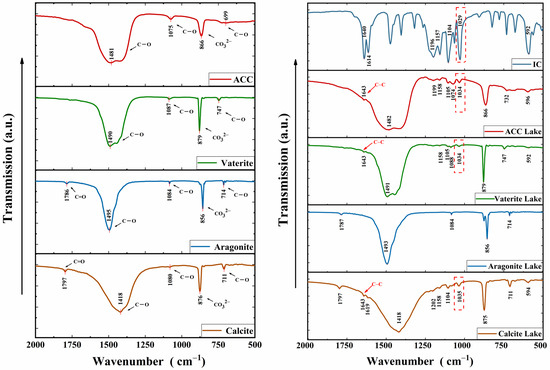 Infrared spectra of IC, different forms of calcium carbonates and their colorant lakes (Red dashed box shows typical peak shift).