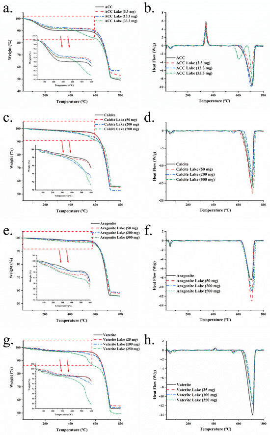 TGA curves (a,c,e,g) and DSC curves (b,d,f,h) of the four forms of calcium carbonates and their colorant lakes.