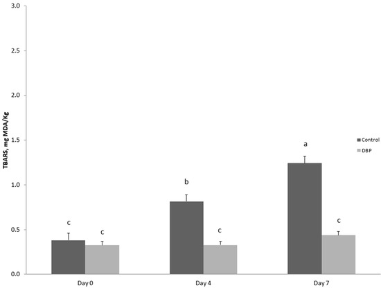 Effects of storage time and dietary treatment on TBARS values evaluated in meat slices during refrigerated storage. Dietary treatment: a basal diet (control) or the basal diet in which 5% of barley grain and 5% of maize grain was replaced by 10% of dried bergamot pulp (DBP). Values presented are estimated least squares means and standard error bars. a, b, c Values with different superscripts are significantly different (p ≤ 0.05). The effect of the diet was p < 0.001, the effect of time was p < 0.001 and the effect of the interaction was p < 0.001.