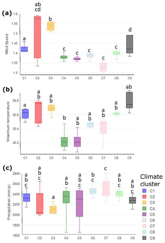Multiple comparisons in climate variables in the 180 farms classified as nine clusters in Arauca. Values with the same letter are not statistical differences among clusters (ANOVA, Tukey’s test, p < 0.05). Charts framed in a rectangle mean variables statistically significant. (a) p-value = 0.0439869, [p(x ≤ F) = 0.956013]; (b) p-value = 0.0462364, [p(x ≤ F) = 0.953764]; (c) p-value = 0.0000992048, [p(x ≤ F) = 0.999901].