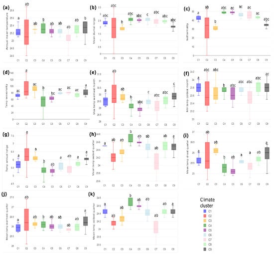 Multiple comparisons in soil temperature in the 180 farms classified as nine clusters in Arauca. Values with the same letter are not statistical differences among clusters (ANOVA, Tukey’s test, p < 0.05). (a) SBIO1_Annual mean temperature, p-value = 0.0232847, [p(x ≤ F) = 0.976715 ]; (b) SBIO2_Mean diurnal range, p-value = 0.00147094, [p(x ≤ F) = 0.998529]; (c) SBIO3_Isotermality, p-value = 1.44085 × 10−7, [p(x ≤ F) = 1]; (d) SBIO4_Temperature seasonality, p-value = 0.00000175783, [p(x ≤ F) = 0.999998]; (e) SBIO5_Max_temperature of warmest month, p-value = 0.0108403, [p(x ≤ F) = 0.98916]; (f) SBIO6_Min_temperature of coldest month, p-value= 0.0159335, [p(x ≤ F) = 0.984066]; (g) SBIO7_Temperature annual range, p-value = 0.000327396, [p(x ≤ F) = 0.999673]; (h) SBIO8_Mean_temperature of wettest quarter, p-value = 0.028066, [p(x ≤ F) = 0.971934]; (i) SBIO9_Mean temperature of driest quarter, p-value = 0.0109722, [p(x ≤ F) = 0.989028]; (j) SBIO10_Mean temperature of warmest quarter, p-value = 0.0247223, [p(x ≤ F) = 0.975278]; (k) SBIO11_Mean temperature of coldest quarter, p-value = 0.0319085, [p(x ≤ F) = 0.968092].