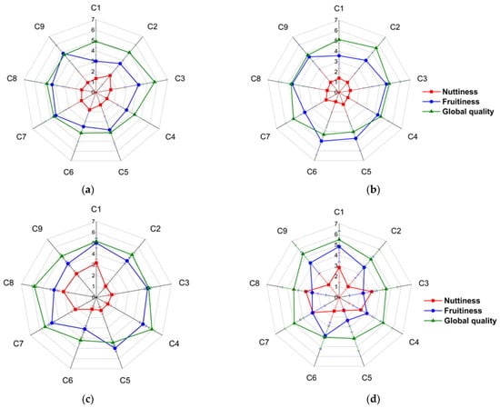Nuttiness, fruitiness attributes and global quality of chocolates made by fermented cocoa at 48 (a), 72 (b), 96 (c) and 120 h (d) of mixtures of cocoa materials from nine cluster (C1, C2, C3, C4, C5, C6, C7, C8 and C9). The numbers correspond to the scoring of the sensory attributes on a 10-point scale 0 (not perceptible) to 10 (very intense).