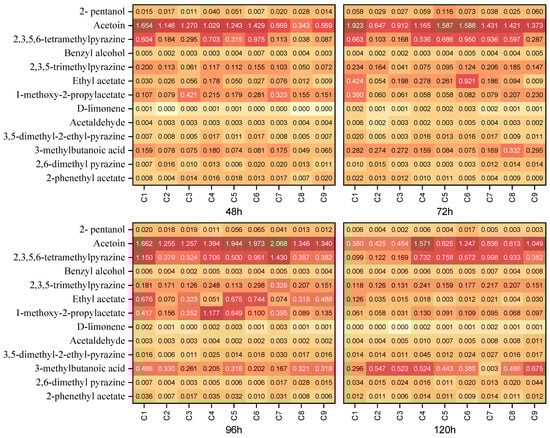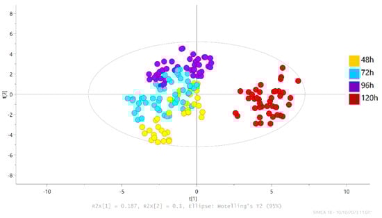 The model demonstrated separation based on fermentation time, and we observed changes in the volatilome throughout the fermentation process from 48 to 120 h, with a more marked change between 96 and 120 h, as shown in Figure 4.