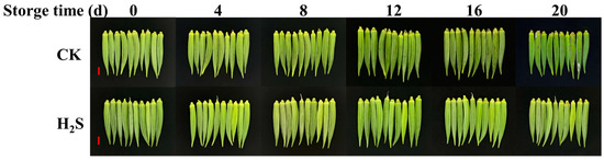The appearance of okra pods in the control group and H2S-treated group during the storage process (0, 4, 8, 12, 16, 20 d). Stored at 5 ± 1 °C, 65–75% RH. Okra pods were fumigated with 0.5 mmol/L NaHS solution for 20 d. CK represents the control group, and H2S represents the H2S-treated group. Bar = 2 cm.