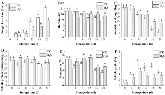 Effect of H2S on the rate of weight loss (A), hardness (B), ascorbic acid (C), soluble protein (D), protopectin (E), and soluble pectin (F) in postharvest okra pods during storage time. Different letters in the graph indicate significant differences between the H2S-treated group and the control (p < 0.05). CK represents the control group, and H2S represents the H2S-treated group. Data are expressed as mean ± SD.