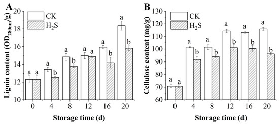 Effect of H2S on lignin (A) and cellulose content (B) in postharvest okra pods during storage time. Different letters in the graph indicate significant differences between the H2S-treated group and the control (p < 0.05). CK represents the control group; H2S represents the H2S-treated group. Data are expressed as mean ± SD.