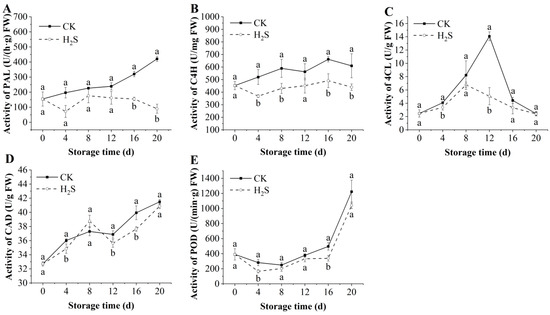 Effect of H2S on PAL (A), CAD (B), 4CL (C), C4H (D), and POD (E) in postharvest okra pods during storage time. Different letters in the graph indicate significant differences between the H2S-treated group and the control (p < 0.05). CK represents the control group, and H2S represents the H2S-treated group. Data are expressed as mean ± SD. FW = fresh weight.