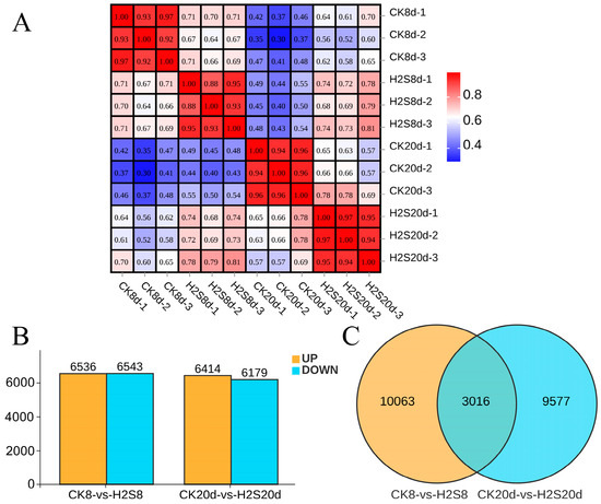 A heatmap of 12 samples is shown in Figure 6A. The Pearson correlation coefficient between the samples is greater than 0.8, indicating good reproducibility of the correlations among the samples. A total of 13,079 and 12,593 DEGs were obtained for CK 8 d-VS-H2S 8 d and CK 20 d-VS-H2S 20 d (Figure 6B). Compared to the control group, there were 6536 DEGs were up-regulated, 6543 DEGs were down-regulated in the H2S-treated group at day 8, 6414 DEGs were up-regulated, and 6179 DEGs were down-regulated at 20 d of storage. From the Venn diagram (Figure 6C), there were 3016 common DEGs shared between CK 8 d-VS-H2S 8 d and CK 20 d-VS-H2S 20 d.