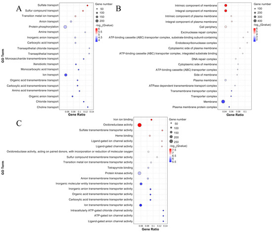 DEGs shared by CK 8 d-VS-H2S 8 d and CK 20 d-VS-H2S 20 d were used as target genes for enrichment analyses. Figure 7 shows the top 20 GO terms with GO enrichment significance in the target genes, including biological process, cellular component, and molecular function. After removing redundancy, a total of 1495 DEGs were enriched in biological process (Figure 7A), with sulfate transport (36, 2.41%) and sulfur compound transport (39, 2.61%) being significantly enriched. A total of 912 DEGs were annotated to cellular components (Figure 7B), and the top two significantly enriched GO terms were intrinsic component of membrane (300, 32.89%) and integral component of membrane (293, 32.13%). A total of 1737 DEGs were annotated to molecular functions (Figure 7C); the analysis showed the significance of genes associated with iron ion binding (63, 3.63%), oxidoreductase activity (264, 15.20%), and sulfate transporter activity (35, 2.01%). The results indicate that DEGs after H2S treatment of okra pods are mainly related to oxidoreductase activity in molecular function.
