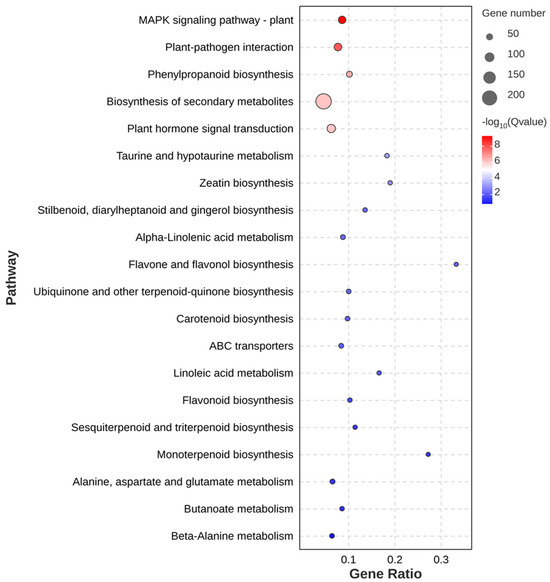 All DEGs were annotated with Gene Ontology (GO) terms from the GO database (http://www.geneontology.org/, accessed on 18 November 2023), with Q-values ≤ 0.05 being significantly enriched GO terms compared to genomic background [28]. The DEGs were compared to the Kyoto Encyclopedia of Genes and Genomes (KEGG) database (http://www.genome.jp/kegg, accessed on 18 November 2023), with Q-values ≤ 0.05 being significantly enriched metabolic pathways compared to the genomic background [29].