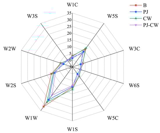 E-nose radar plot of Paddy Field Carp with different deodorization treatments. Note: B: blank group; PJ: perilla juice; CW: cooking wine; PJ-CW: perilla juice and cooking wine. The scale value (from −5 to 35) represents the response value of the sensor, which is the ratio of the conductivity G of the sample gas passing through the sensor to the conductivity Go of the standard gas filtered by activated carbon passing through the sensor, i.e., G/Go.