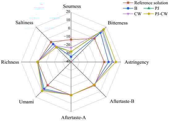 E-tongue radar plot of Paddy Field Carp with different deodorization treatments. Note: B: blank group; PJ: perilla juice; CW: cooking wine; PJ-CW: perilla juice and cooking wine. The scale value (from −40 to 20) indicates that the response value of the sensor is equivalent to the level of taste value.