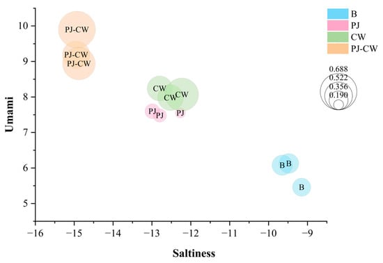 Saltiness, umami and richness bubble chart of Paddy Field Carp with different deodorization methods. Note: B: blank group; PJ: perilla juice; CW: cooking wine; PJ-CW: perilla juice and cooking wine.