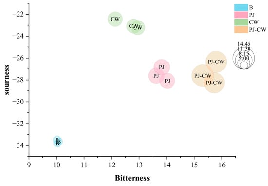Bitterness, sourness and astringency bubble chart of Paddy Field Carp with different deodorization methods. Note: B: blank group; PJ: perilla juice; CW: cooking wine; PJ-CW: perilla juice and cooking wine.
