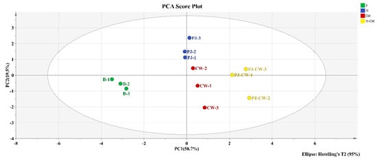 E-tongue PCA score plot of Paddy Field Carp with different deodorization treatments. Note: B: blank group; PJ: perilla juice; CW: cooking wine; PJ-CW: perilla juice and cooking wine.