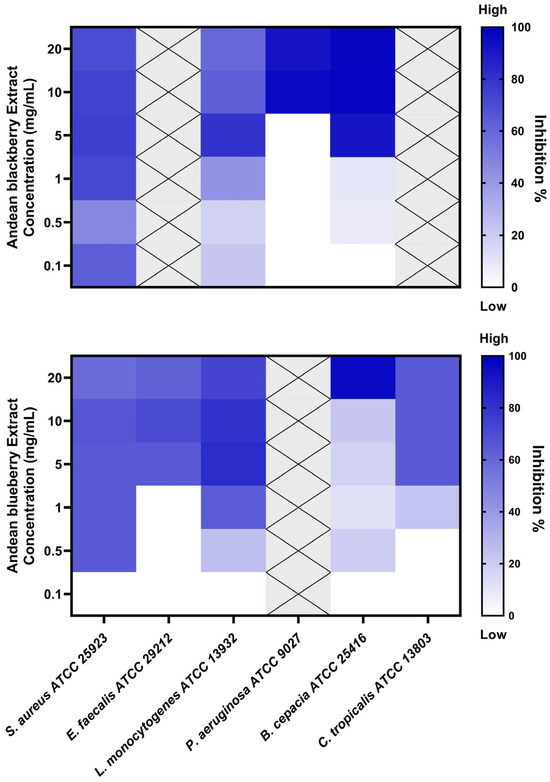 The antibiofilm activity of the extracts was evaluated against various biofilm-forming microorganisms. S. aureus ATCC 25923, E. faecalis ATCC 29212, L. monocytogenes ATCC 13932, P. aeruginosa ATCC 9027, B. cepacia ATCC 25416, and the fungal strain Candida tropicalis ATCC 13803 were cultured in Tryptic Soy Broth medium supplemented with 1% glucose (TSB+G) overnight at 37 °C. Subsequently, microbial suspensions were prepared at a 1:100 dilution of the overnight cultures, with or without berry extracts (50 to 0.1 mg/mL). A 150 µL aliquot of each suspension was added to 96-well polystyrene plates. The plates were incubated at 37 °C under static conditions for 24 h. The medium containing free-floating microbes was removed by aspiration with a micropipette, and the wells were washed three times with phosphate-buffered saline (PBS) 1X (pH 7.2). The plates were dried for 1 h at 60 °C in a laboratory oven. The biofilms were then stained with 150 µL of 0.1% crystal violet for 20 min at room temperature, followed by three washes with PBS 1X (pH 7.2). Finally, 150 µL of 96% ethanol was added to each well for 30 min, and the optical density (OD) of the samples was measured at 570 nm. The biofilm inhibition percentage was calculated using the following formula: