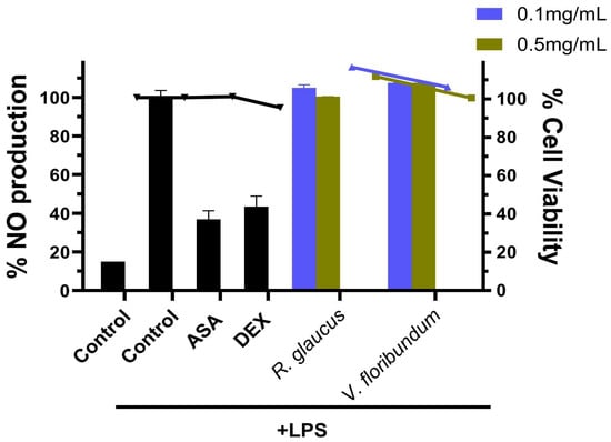 Anti-inflammatory activity of R. glaucus and V. floribundum extracts. RAW264.7 cells were pretreated with the sample compounds and then stimulated with LPS. The percentage of NO production was calculated using cells treated with LPS only (control + LPS) as 100% NO production (right Y axis). Aspirin (ASA) and dexamethasone (DEX) were used as positive controls, and cells were incubated only with cell media as negative controls (control). Bars represent the percentage of NO production. Dots and lines represent the % cell viability for each corresponding dataset (left Y axis)—black: R. glaucus; blue: Vaccinium floribundum extract.