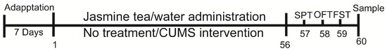 This study involved male Sprague Dawley rats obtained from Silaikejingda Experimental Animal Co., Ltd. (Changsha, China) at 4 weeks old and kept in a specific pathogen-free facility at Hunan Agricultural University. All procedures and animal care in this research were strictly carried out in accordance with the Institutional Review Board guidelines and ethical standards set by the Animal Protection Committee of Hunan Agricultural University (Changsha, China). The rats were given one week to acclimate before the experiments began. Rats were housed at a room temperature of 25 ± 1 °C, a relative humidity of 50–60%, with a 12 h light/dark cycle. The experimental food was a common basic feed provided by Nantong Trophy Feed Company (Nantong, China), which contained carbohydrates, protein, and a small amount of fat, as well as various essential nutrients for rat growth. After adaption, rats were divided into three groups at random, including control (treated with water), model (CUMS treated with water), and NF (CUMS-treated rats treated with jasmine tea at a concentration of 64.8 mg/kg) (n = 10 for per group). The model and NF group experienced a range of stressors during the whole experiment (8 consecutive weeks) (Figure 1). Jasmine tea was manufactured with jasmine flowers and green tea by ourselves using a new scenting process. During the stress intervention, jasmine tea soup was prepared with drinking water and taken orally once a day at a concentration of 64.8 mg/kg (1 mL/kg/day) based on our previous research [26] until the end of the experiment. The oral dose was calculated according to the body weight of each individual rat. The Con (control) and Mod (model, which was treated with CUMS) groups received the drinking water based on the body weight of each individual rat.