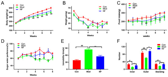 Results of the behavioral tests. (A) Body weight during the experiment. (B) Body weight gain during the experiment. (C) Food intake during the experiment. (D) Sugar preference during the experiment. (E) Immobility time comparison of FST. (F) The comparison of number of inners, outers, and standing in OFT. Con, control; Mod, model; NF, CUMS treated with jasmine tea. SPT, sugar preference test; FST, force swimming test; OFT, open field test. # p < 0.05, ## p < 0.01 versus the control group; * p < 0.05, ** p < 0.01 versus the model group.