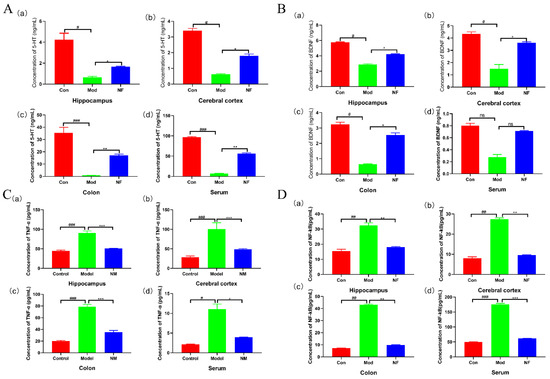 The concentrations of 5-HT, BDNF, TNF-α, and NF-κB in the cerebral cortex, hippocampus, colon, and serum were measured using rat 5-HT, BDNF, TNF-α, and NF-κB ELISA kits (Cusabio Biotech., Ltd., Wuhan, China). The concentrations of 5-HT, BDNF, TNF-α, and NF-κB were assessed by measuring the absorbance with ABI Quant Studio 3 (Thermo Scientific, Wilmington, NC, USA) and creating a standard curve.