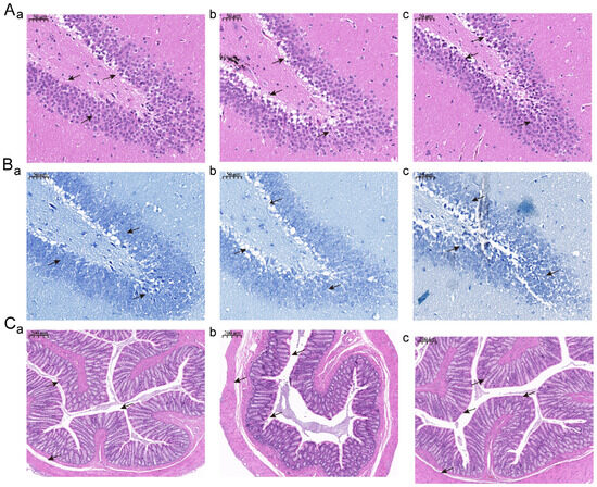 The histological analysis was conducted according to Liu’s procedure [29]. Brain and colon tissue specimens were fixed in 10% formalin (Wuhan Pinofei Biological Technology Co., LTD, Wuhan, China), followed by decalcification and dehydration to achieve transparency. Subsequently, they were immersed and embedded in paraffin. Thin tissue samples measuring 3–6 μm were then obtained using a microtome (Shanghai Leica Instrument Co., LTD, Shanghai, China). These samples were dewaxed with xylene (Sinopharm Group Chemical reagent Co., LTD, Shanghai, China), treated with an aqueous ethanol series (Sinopharm Group Chemical reagent Co., LTD, Shanghai, China), and stained with H&E and Nissl for brain examinations, HE for the colon examinations, and observed using 250 pieces white light scanner (3DHISTECH, Budapest, Hungary).