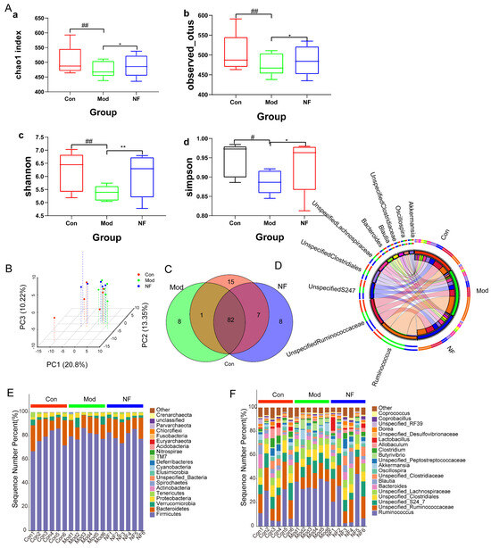 Gut microbial characteristics of Con, Mod, and NF. (A) Alpha-phylogenetic diversity analysis showed that depressive-like rats induced by CUMS had lower microbial richness in four indexes relative to controls; these indexes had increased when administrated with jasmine tea. (B) Principal component analysis (PCA) revealed that the gut microbiome composition in rats with depressive-like symptoms induced by CUMS was markedly distinct from that of Con, and the intestinal microbial composition of depressive-like induced by CUMS was restored after being treated with jasmine tea. (C) Venn diagram for taxonomy of gut microbes based on genus level. (D) Circus circle diagram of the top 10 relative abundances in intestinal microbial classification based on genus level. (E) The gut microbiota compositions among the experimental groups at the phylum level. (F) The relative abundance of gut microbes at the genus level. # p < 0.05, ## p < 0.01 versus the control group; * p < 0.05, ** p < 0.01, versus the model group.