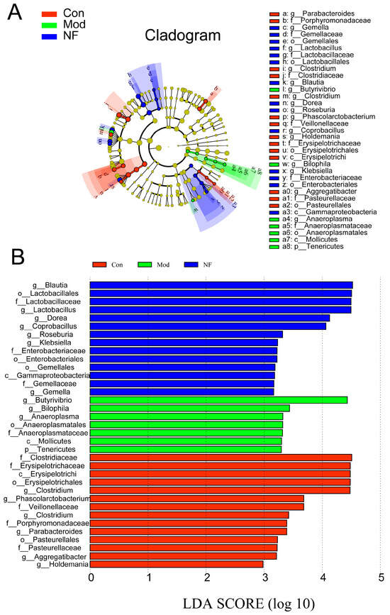 Linear discriminant analysis effect size (LEfSe) analysis was conducted with a threshold of LDA > 2.0. The results were visualized using a cladogram (A) and a histogram (B) and showed 35 genera responsible for discriminating in Con, Mod, and NF.
