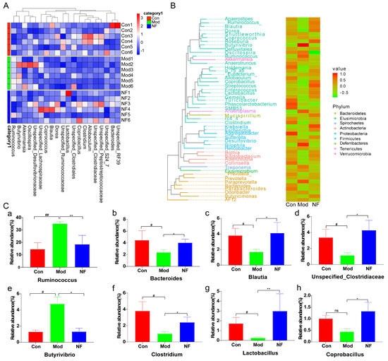A cladogram produced through LEfSe analysis of the gut microbiome dataset (Figure 6A,B) indicated that, at the genus level, there were 7 differentially abundant clades in Mod and 14 differentially abundant clades in NF (p < 0.05, LDA > 2.0). In total, 35 different genera were identified. There were 14 genera in Con, mainly included in g__Blautia, o__Lactobacillales, f__Lactobacillaceae, g__Dorea, g__Lactobacillus, g__Coprobacillus, g__Klebsiella, g__Roseburia, f__Enterobacteriaceae, o__Enterobacteriales, o__Gemellales, c__Gammaproteobacteria, f__Gemellaceae, and g__Gemella. The CUMS-treated rats were characterized by seven genera, including g__Butyrivibrio, g__Bilophila, g__Anaeroplasma, o__Anaeroplasmatales, f__Anaeroplasmataceae, p__Tenericutes, and c__Mollicutes. There were 14 genera in CUMS-treated rats after administration with jasmine tea, including f__Clostridiaceae, f__Erysipelotrichaceae, c__Erysipelotrichi, o__Erysipelotrichales, g__Clostridium, g__Phascolarctobacterium, f__Veillonellaceae, g__Clostridium, f__Porphyromonadaceae, g__Parabacteroides, o__Pasteurellales, f__Pasteurellaceae, g__Aggregatibacter, and g__Holdemania. The microbial composition was further determined by taxonomic profiling (Figure 7A,B). At the genus level (Figure 7C), the abundance of Ruminococcus and Butyrivibrio was significantly increased in Mod when compared with Con, but this phenomenon could be alleviated after the jasmine tea intervention. Moreover, the relative abundance of Bacteroides, Blautia, Unspecified_Clostruduaceae, Clostridium, Lactobacillus, and Coprobacillus in CUMS-treated rats was significantly increased after jasmine tea administration (Figure 7C).