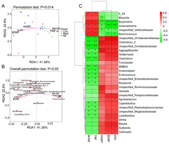 Associations of gut microbes with neurotransmitters and inflammation factors based on Spearman correlation analysis. (A) The composition of intestinal microorganisms based on the genus level and environmental factors being analyzed through a mapping test. (B) Overreplacement test map of intestinal microorganisms based on generic levels and environmental factors. (C) Visualization of Spearman’s rank correlation in the form of a heatmap of 30 genera and neurotransmitters, with inflammations in colon. * p < 0.05, ** p < 0.01, *** p < 0.001.