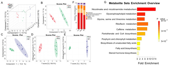 Multivariate analysis of metabolic profiles of Con, Mod, and NF. (A–C) The evaluation scatter plots of different groups from the PLS-DA data. (D) Con and Mod pairwise comparison OPLS-DA evaluation scatter plots. (E) Mod and NF pairwise comparison OPLS-DA evaluation scatter plots. (G) Stacked column chart of the percentage of metabolites that play a biological role. (F) Pathway topology enrichment among different treatments.