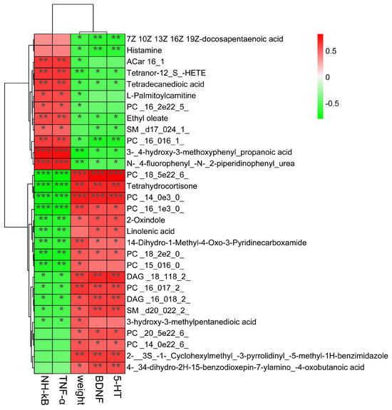 To further study the potential correlations among neurotransmitters, inflammation, and the serum metabolome, a Spearman correlation analysis was conducted (Figure 10). The analysis revealed that the neurotransmitters, inflammation, and metabolites in the serum samples had a correlation. The results showed that PC (16:0/16:1), 3,4-hydroxy-3- methoxyphenyl-propanoic acid, N-4-fluorophenyl-N-2-piperidinophenyl urea, etc., were significantly negatively correlated with body weight, 5-HT, and BDNF, while those metabolites were highly positively correlated with TNF-α and NF-κB. Moreover, PC (18:5e/22:6), tetrahydrocortisone, PC (14:0e/3:0), 2-oxindole, etc., showed a strongly positive relationship with body weight, 5-HT, and BDNF, and showed a strongly negative relationship with TNF-α and NF-κB.