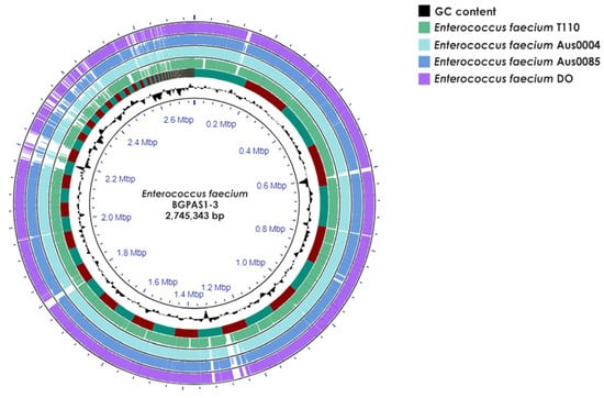 The total DNA of En. faecium BGPAS1-3 was extracted by the method described previously []. Total DNA quality and concentration were evaluated by agarose gel electrophoresis and by a Bio-Spec nano (Shimadzu, Tokyo, Japan) spectrophotometer. The whole-genome sequencing (WGS) of the En. faecium BGPAS1-3 genome was performed on the Illumina HiSeq 2500 platform by the MicrobesNG service (MicrobesNG, IMI-School of Biosciences, University of Birmingham, Birmingham, UK) using a 2 × 250 bp paired-end strategy. Library preparation was carried out using the Nextera XT Library Prep Kit (Illumina, San Diego, CA, USA), with minor modifications to the manufacturer’s protocol. Specifically, 2 ng of input DNA was used, and the PCR elongation time was extended to 1 min. The process was executed on a Hamilton Microlab STAR (Hamilton, Reno, NV, USA). Pooled libraries were quantified with a Roche LightCycler 96 qPCR machine (Roche, Indianapolis, IN, USA) using the Kapa Biosystems Library Quantification Kit for Illumina. Trimmomatic v0.30 [] with a sliding window quality cutoff of Q15 was used for adapter trimming. De novo assembly was performed using SPAdes v3.7 [], and contigs were annotated using Prokka 1.11 []. Kraken software [] was used to identify the closest available reference genome, and BWA MEM [] was used for mapping the reads to the reference genome. Draft genome sequences of BGPAS1-3 have been deposited in GenBank under accession number JAUKVL000000000.
