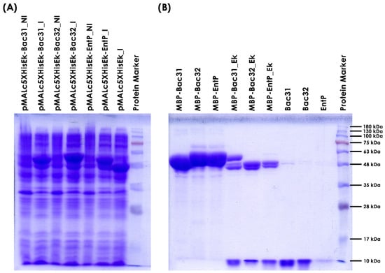 Transformants of E. coli ER2523 (pMALc5HisEk_Bac31, pMALc5HisEk_Bac32, and pMALc5HisEk_EntP) were maintained overnight on LB Agar Petri dishes containing ampicillin (100 µg/mL) and glucose (1%) at 30 °C. The next day, new cultures (each 200 mL of LB with 1% glucose and 100 µg/mL ampicillin) were inoculated using a 2% overnight culture and incubated at 30 °C with aeration (180 rpm on a rotatory shaker). Expression of recombinant peptides was induced in the logarithmic growth phase (OD600 = 0.8–1.0) with the addition of 0.3 mmol/L (final) IPTG for 3 h. Bacterial cells were collected by centrifugation at 4500× g and frozen at −20 °C. Before purification, the level of induction was tested by comparing the amounts of total proteins from the same amount of induced and non-induced cells. Purification including cell lysis, affinity chromatography, and cleavage of the fusion protein with enterokinase was performed according to the manufacturer’s instructions (amylose resin purification, according to pMAL Protein Fusion & Purification System, New England Biolabs, Ltd., UK; Ni-NTA agarose resin purification, according to The QIAexpressionist, Qiagen Gmbh, Hilden, Germany; cleavage with recombinant bovine enterokinase in 1× enterokinase buffer (20 mmol/L Tris-HCl, pH 7.4, 50 mmol/L NaCl, 2 mmol/L CaCl2) using 10 U, according to GenScript, Piscataway, NJ, USA), with the addition of a cell lysis step that was performed in column buffer (CB) with 1 mg/mL lysozyme for 30 min on ice. The total protein concentrations were determined using the BSA protein assay kit (Thermo Fisher Scientific, Waltham, MA, USA). Total protein concentrations were measured using the BSA protein assay kit (Thermo Fisher Scientific, Waltham, MA, USA). Proteins from all stages of expression, purification, and proteolysis were analyzed by 12.5% sodium dodecyl sulfate-polyacrylamide gel electrophoresis (SDS-PAGE). For SDS-PAGE, samples were mixed with 2 × sample loading buffer (125 mmol/L Tris-HCl pH 6.8, 10 mmol/L EDTA, 4% SDS, 25% glycerol, 5% β-mercaptoethanol, 0.07% bromophenol blue) at a 1:1 ratio. Before loading onto the gel, samples were denatured by heating at 100 °C for 5 min.