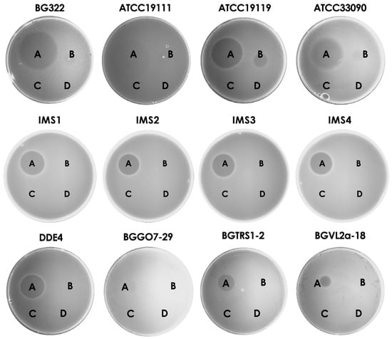 Antimicrobial effect of purified bacteriocins on indicator strains. Note: A—bacteriocin 31; B—bacteriocin 32; C—enterocin P; D—Enterokinase buffer.