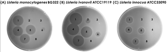 3.5. Purified Bacteriocins Are Active against Listeria sp. and Lactic Acid Bacteria
