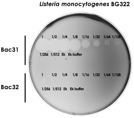 Since we demonstrated the strong antimicrobial activity of bacteriocin 31 and the weak antimicrobial activity of bacteriocin 32, the next goal was to determine arbitrary units per milliliter/mg of purified bacteriocins. We showed that bacteriocin 31 retained its antimicrobial activity after the eight two-fold dilutions against BG322, while bacteriocin 32 lost its activity after the second two-fold dilution. Since the concentrations of both bacteriocins after purification were similar (bacteriocin 31, 2.3 ± 0.3 μg/μL, and bacteriocin 32, 2.8 ± 0.2 μg/μL), it was concluded that bacteriocin 31 was more potent against all L. monocytogenes strains (Figure 5).