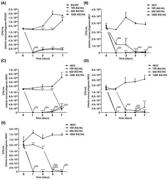 Reduction in Listeria monocytogenes in a milk model with purified bacteriocin 31. L. monocytogenes BG322 (A), L. monocytogenes IMS1 (B), L. monocytogenes IMS2 (C), L. monocytogenes IMS3 (D), and L. monocytogenes IMS4 (E). Note: Statistical significance p < 0.05 ****.