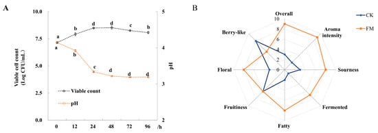 Changes of pH, viable cell count and organoleptic characteristics of mulberry juice samples (n = 3). (A) Changes of pH and viable cell count during 96 h of fermentation; (B) Radar plot of CK (unfermented juice) and FM (fermented juice) samples based on the organoleptic characterizations. Different letters represent significant differences (p < 0.05).