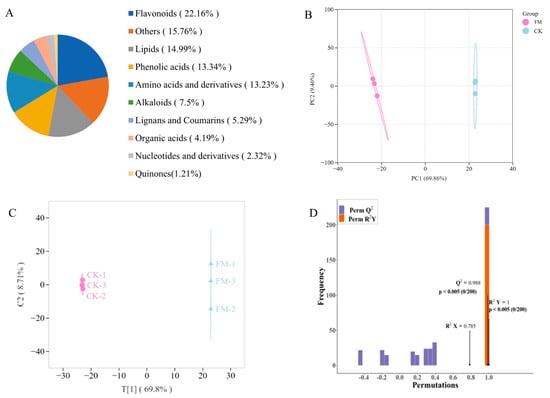 A widely targeted metabolomics analysis was conducted on metabolites using UPLC-MS/MS, and a total of 907 metabolites were detected in all samples (Figure 2A), including 68 alkaloids, 127 amino acids and derivatives, 201 flavonoids, 48 lignans and coumarins, 136 lipids, 21 nucleotides and derivatives, 38 organic acids, 121 phenolic acids, 11 quinones, and 143 others. The OPLS-DA model was employed to preliminarily identify significant differences between samples. As shown in Figure 2B,C, there was a significant difference between CK and FM groups, indicating that varying contents of non-volatile metabolites resulting from strain BXM2 fermentation. Model validation (Figure 2D) revealed that the OPLS-DA model was successfully constructed with R2X, R2Y, and Q2 values of 0.785, 1.00, and 0.988, respectively, indicating that the model had good interpretability and credibility. Therefore, it is suitable for exploring the differential non-volatile metabolites.