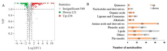 Based on the VIP values obtained from the OPLS-DA model (Figure 3A), using VIP > 1 and fold change ≥ 2 or ≤0.5 as the selection criteria, a total of 359 differential metabolites were obtained, including 238 upregulated and 121 downregulated metabolites. Further statistical analysis (Figure 3B) revealed that amino acids and derivatives (up 64, down 4), flavonoids (up 49, down 16), organic acids (up 12, down 3), quinones (up 5), alkaloids (up 10, down 5) and phenolic acids (up 22, down 19) were the upregulated subcategories, while nucleotides and derivatives (up 5, down 7) were the downregulated category. Upon examination of the secondary classification (Figure 4), it was found that free fatty acids (up 24, down 4) exhibited an upregulated trend, while lysophosphatidylcholine (LPC, down 17) and glycerol ester (down 11) were downregulated.
