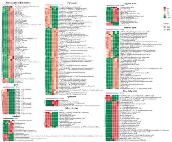 Heatmap of the levels of main differential non-volatile metabolites between CK and FM groups. CK, unfermented mulberry juice; FM, fermented mulberry juice. “*” indicates the presence of isomers of the substance.