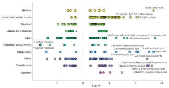 Class scatter plot of differential metabolites (Note: Each point in the figure represents a metabolite, and different colors indicate different classifications. The size of the dot represents the VIP value. The top 10 compounds with the highest Log2 FC are as follows: octadeca-9,12,15-trienoic acid, tropic acid, indole-3-lactic acid, DL-3-phenyllactic acid, 2-hydroxy-3-phenylpropanoic acid, methyl 2,4-dihydroxyphenylacetate, 2-hydroxy-3-(4-hydroxyphenyl)propanoic acid, 2,6-dimethoxybenzaldehyde, 4-hydroxyphenyllactic acid, 2-hydroxy-4-methylpentanoic acid, and L-prolyl-L-leucine).