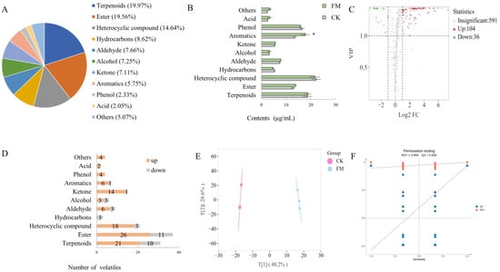 Screening and statistical analysis of differential volatile compounds. (A) Pie chart of volatile category composition; (B) Bar chart of the contents of volatiles; (C) Volcano plots of differential volatiles; (D) Bar chart of the number of the differential volatiles; (E) OPLS-DA score plot; (F) Validation of OPLS-DA model by permutation testing. The * means a significant difference (p < 0.05).