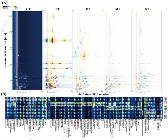 (A) Two-dimensional (comparative difference) fingerprint spectrum; (B) four types of scented teas and green tea, as determined by means of GC–IMS.