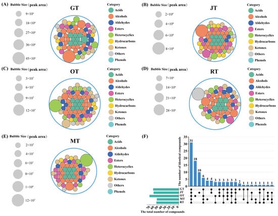 (A–E) Circle packing plots (bubble size indicates the peak area) and (F) UpSet diagram of the volatile profiles detected by means of GC–MS. (GT: green tea, JT: jasmine tea, OT: osmanthus tea, MT: michelia tea, RT: rose tea).