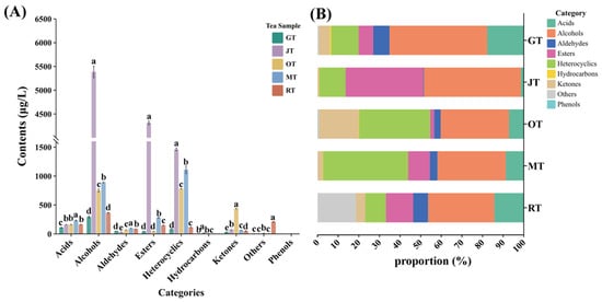 (A) Content of different types of volatile compounds in different tea samples (mean ± SD). The different letters on the bar chart indicate that the relative concentration of compounds is significantly different (p < 0.05). (B) Proportion of different classes of volatile compounds in different tea samples. (GT: green tea, JT: jasmine tea, OT: osmanthus tea, MT: michelia tea, RT: rose tea).